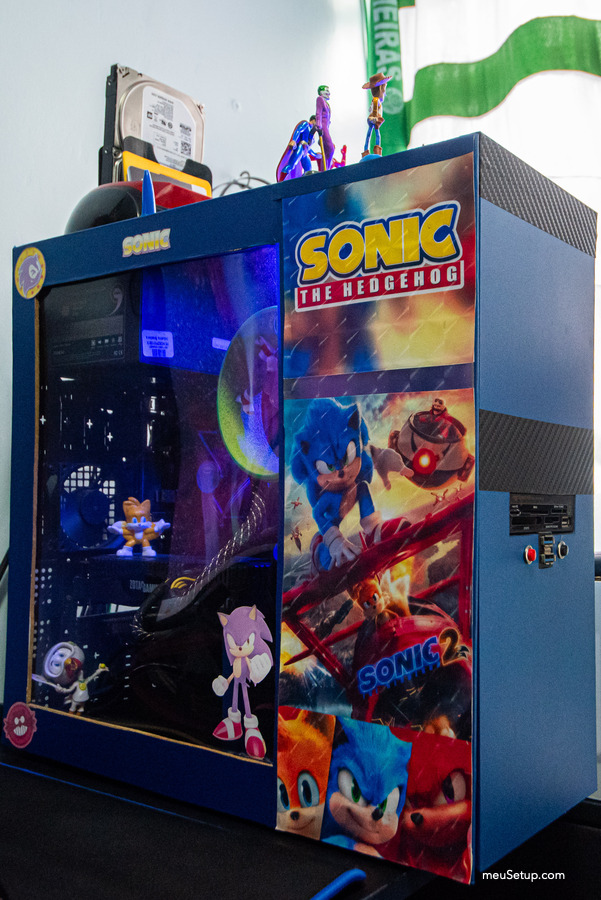 Meu gabinete é personalizado com o tema do Sonic a qual peguei um gabinete velho, desmontei, pintei de preto e dei um acabamento em volta com madeira (sobras de guarda-roupas) e adesivei com vinil azul metálico e restos de adesivo fibra de carbono.