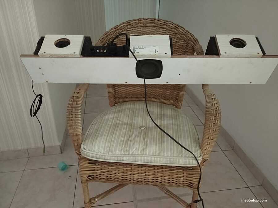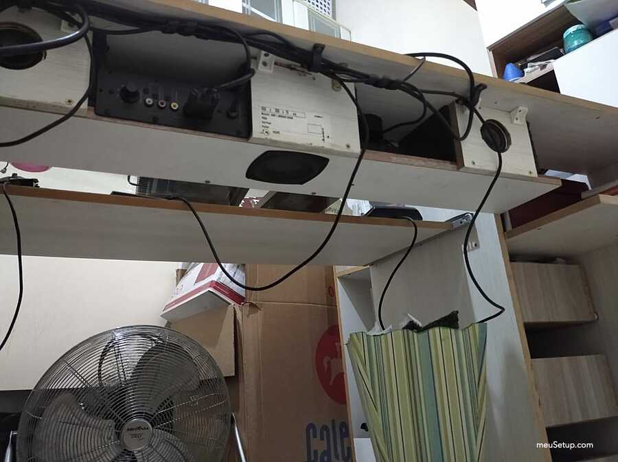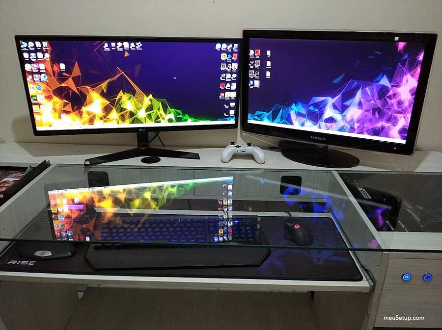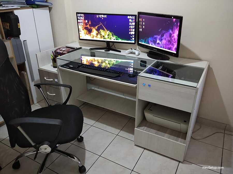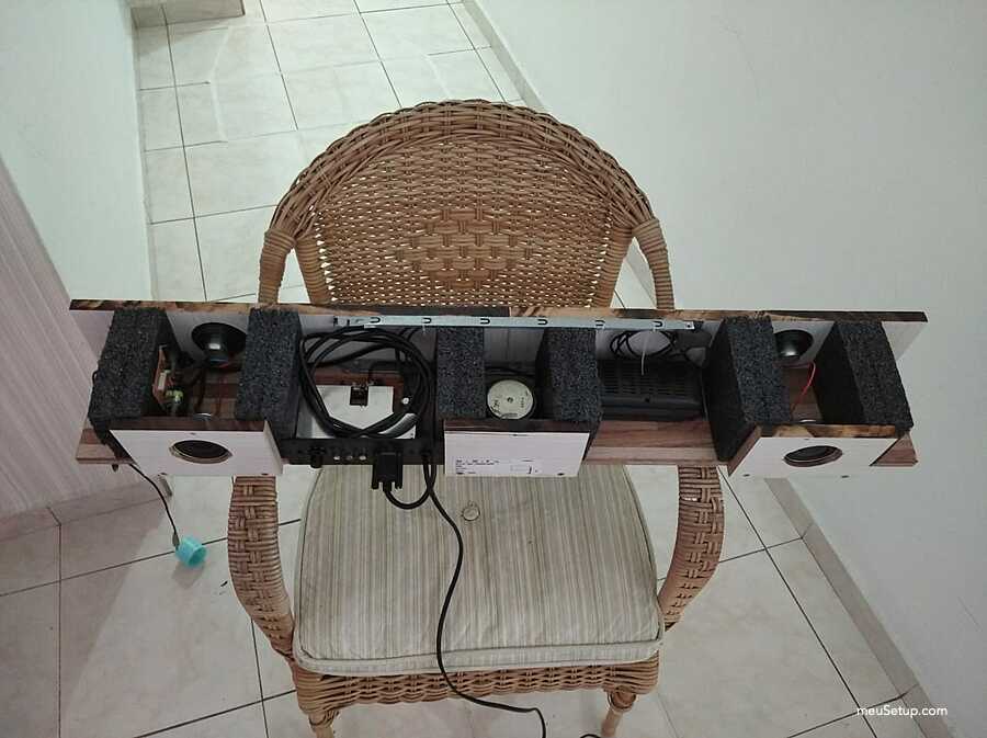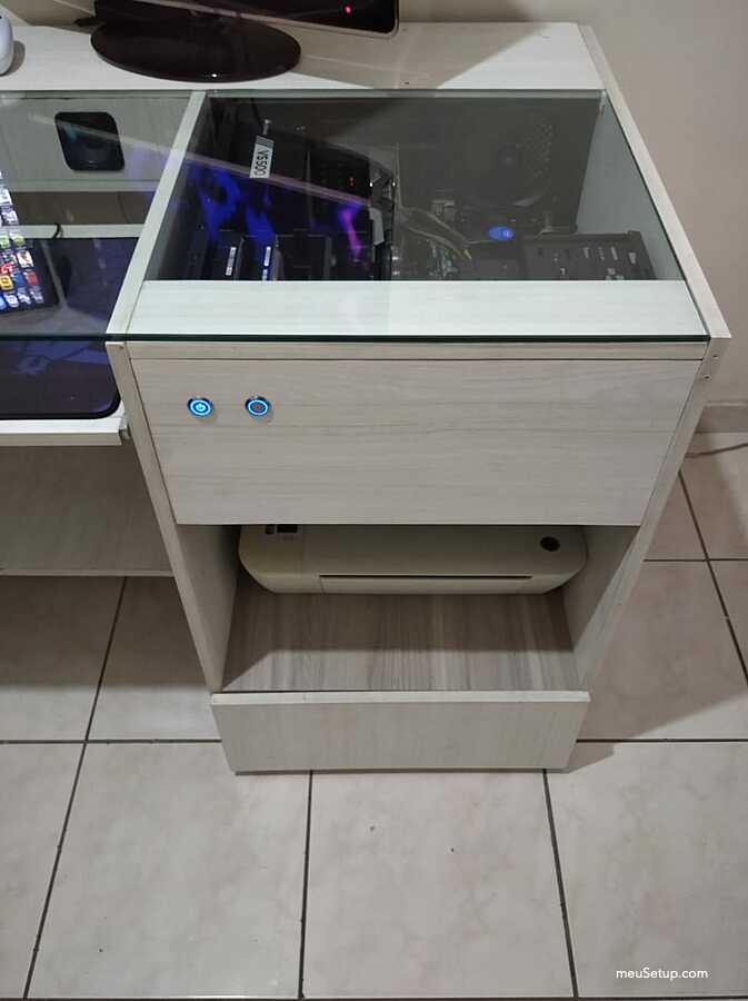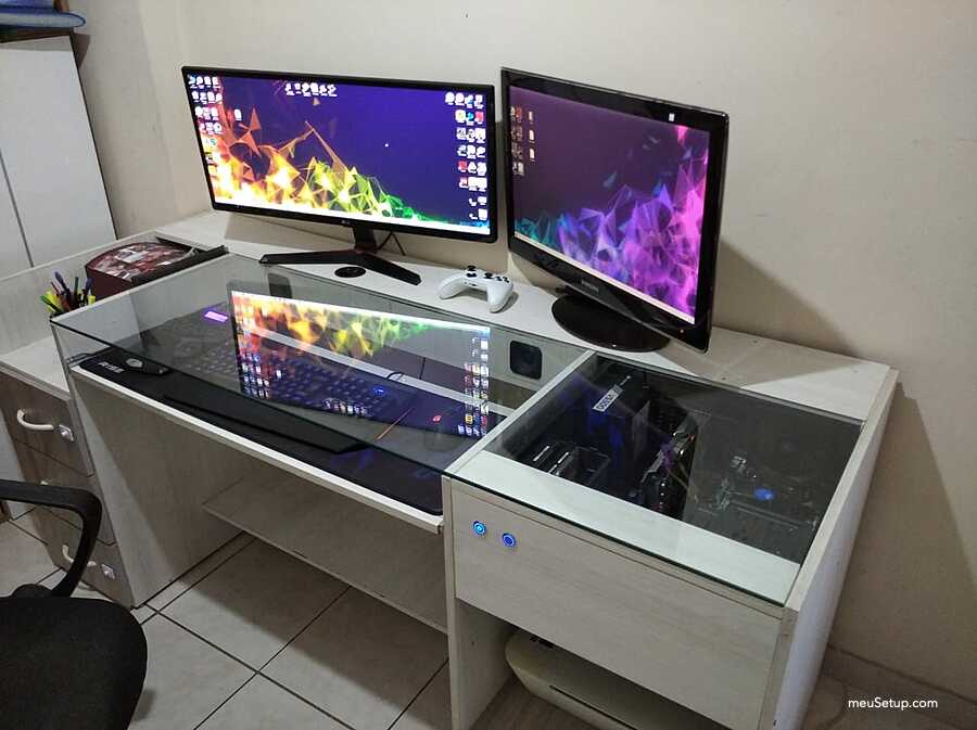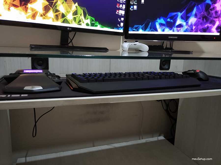 Olá, este setup foi todo projetado e montado por mim. Eu tinha uma mesa bem grande e com a recente febre de steups personalizados acabei modificando fazendo o meu. É claro que ainda não está aquele projeto dos sonhos, mesmo porque falta grana, mas fiz o que deu. O grande diferencial desta mesa é que embuti as minhas caixas de som da Logitech na mesa e tive que pesquisar um pouco sobre caixas de som para não ter perda na qualidade do som. Também fiz ao maximo para que os cabos ficassem organizados e tive que me preocupar com a ventilação que são duas, uma pela frente (logo abaixo dos botões) e outra na lateral que vai para traz do gabinete. Agora sigo me preparando financeiramente para o próximo setup que poderá competir com os melhores já postados aqui no site, mas antes disso pretendo instalar watercollers custom no PC.